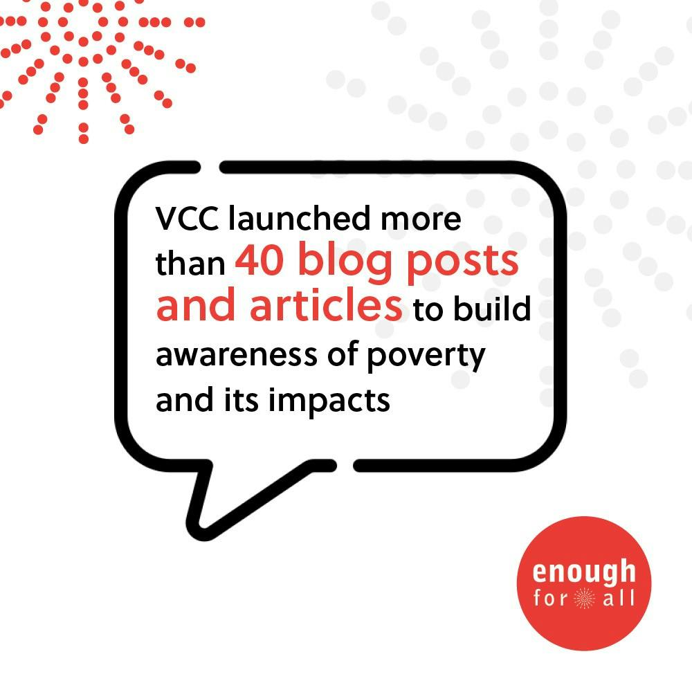 • Continue to build government relations strategies and prioritize policy and system change work. Build on the momentum that VCC and Champions have initiated and continue to ‘push’ for Basic Income, Living Wage, increases to the Alberta Child and Family Benefit and expansion of social and financial supports for those with precarious employment.